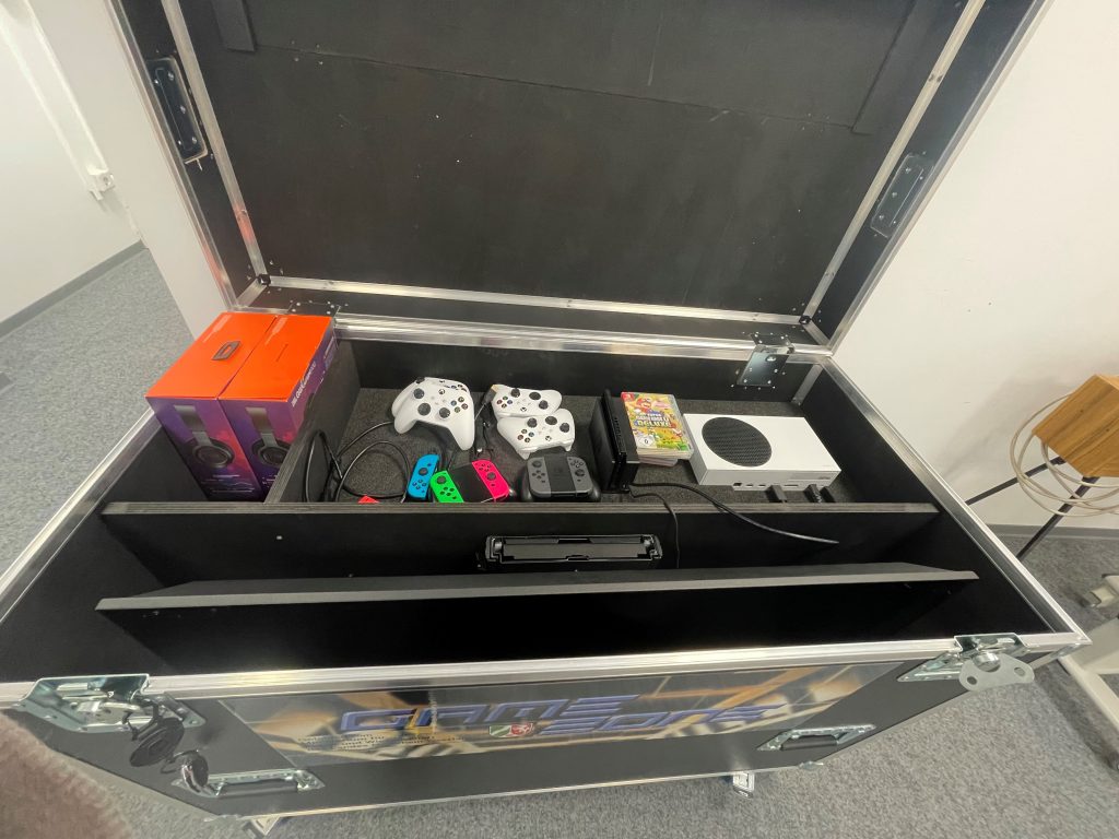 Ein weiteres Kriterium: Das technische Equipment kann schnell und sicher verstaut werden. Das Team entschied sich für das mobile Flightcase mit integriertem Bildschirm und Konsolen von der Firma „Tracs“ aus Belgien. Das Flightcase hat die Abmessungen 1m x 1,25 m x 0,64 m (HxBxT). In dem Transportkoffer befinden neben einem versenkbaren Gaming-Bildschirm auch die drei aktuell gängigsten Konsolen (Nintendo Switch, Sony Playstation5 und XBox) inklusive Controller. Die Box ist durch Rollen mobil und daher in der gesamten Bücherei einsetzbar.